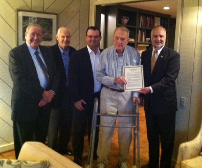 The Board passed a resolution citing that Bell is a person of "great wisdom and integrity, who is highly esteemed by fellow Board members and Thermal Energy Corporation's employees." Former Texas Medical Center CEO Richard Wainerdi, TECO Vice Chairman Don DeWalch, TECO President and CEO Steve Swinson and current Chairman Brad Howell (far right) presented Mr. Bell with an honorary plaque to mark the occasion at his home in April 2014.