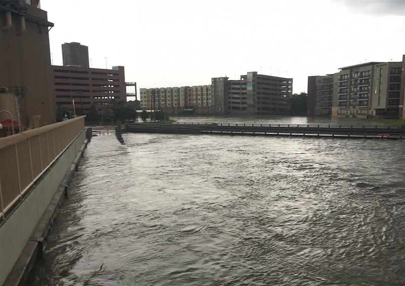 TECO’s floodwalls and floodgates successfully held back high water levels, particularly from Brays Bayou, shown in the accompanying photo taken August 28, 2017 (click to enlarge). Designed to protect the plant from a 500-year flood, plus 2 feet, the floodwalls and floodgates were installed in 2003 and have definitely done their job.